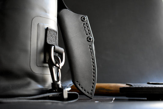 Handmade full grain leather pocket sheaths for the Schwarz Knives Overland Sport fixed blade. Mummert Clip Compatible, or 6AL-4V titanium clip.