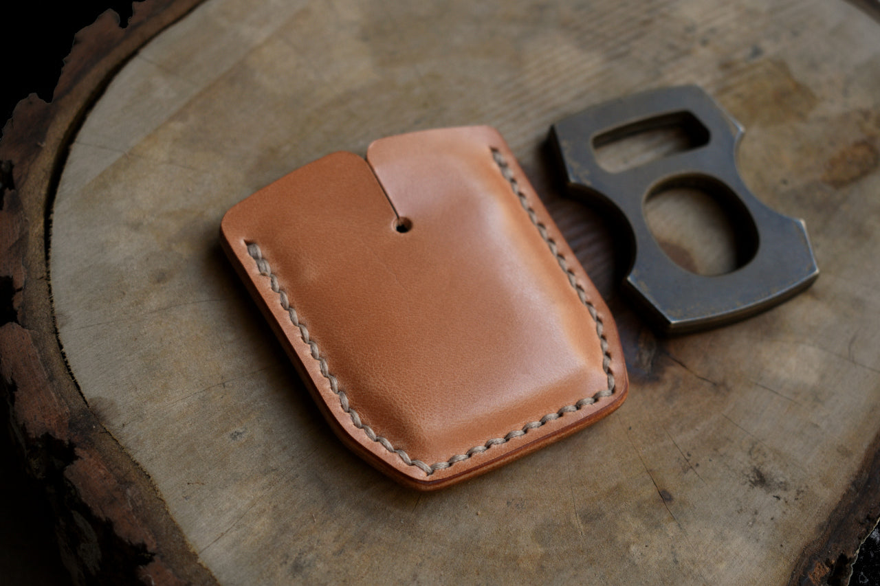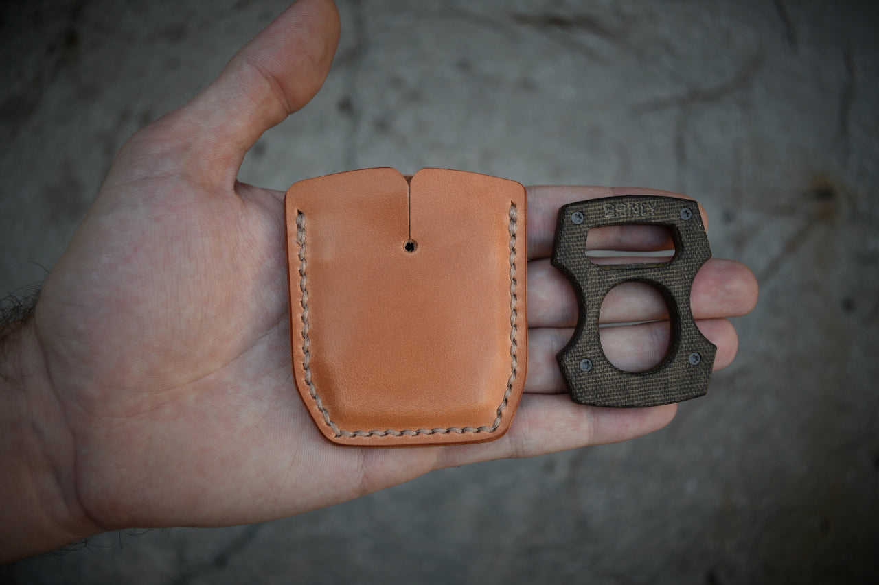 An expertly crafted leather sheath for your favorite beer buddy, the BRNLY Cypop. Cut, punched, stitched, stamped, and finished entirely by hand right here in Florida. The Ritza Tiger thread is saddle stitched by hand for heirloom durability. Properly fitted for .25" thick Cypops.