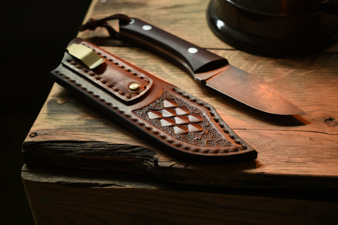 This handcrafted leather pocket sheath is tailor made for the EDC1 Bowie from BMKT. Keep your blade handy at all times in this durable, hard wearing daily carry sheath. Heavy spring clip allows for one handed draw while the sheath stays firmly in your pocket.