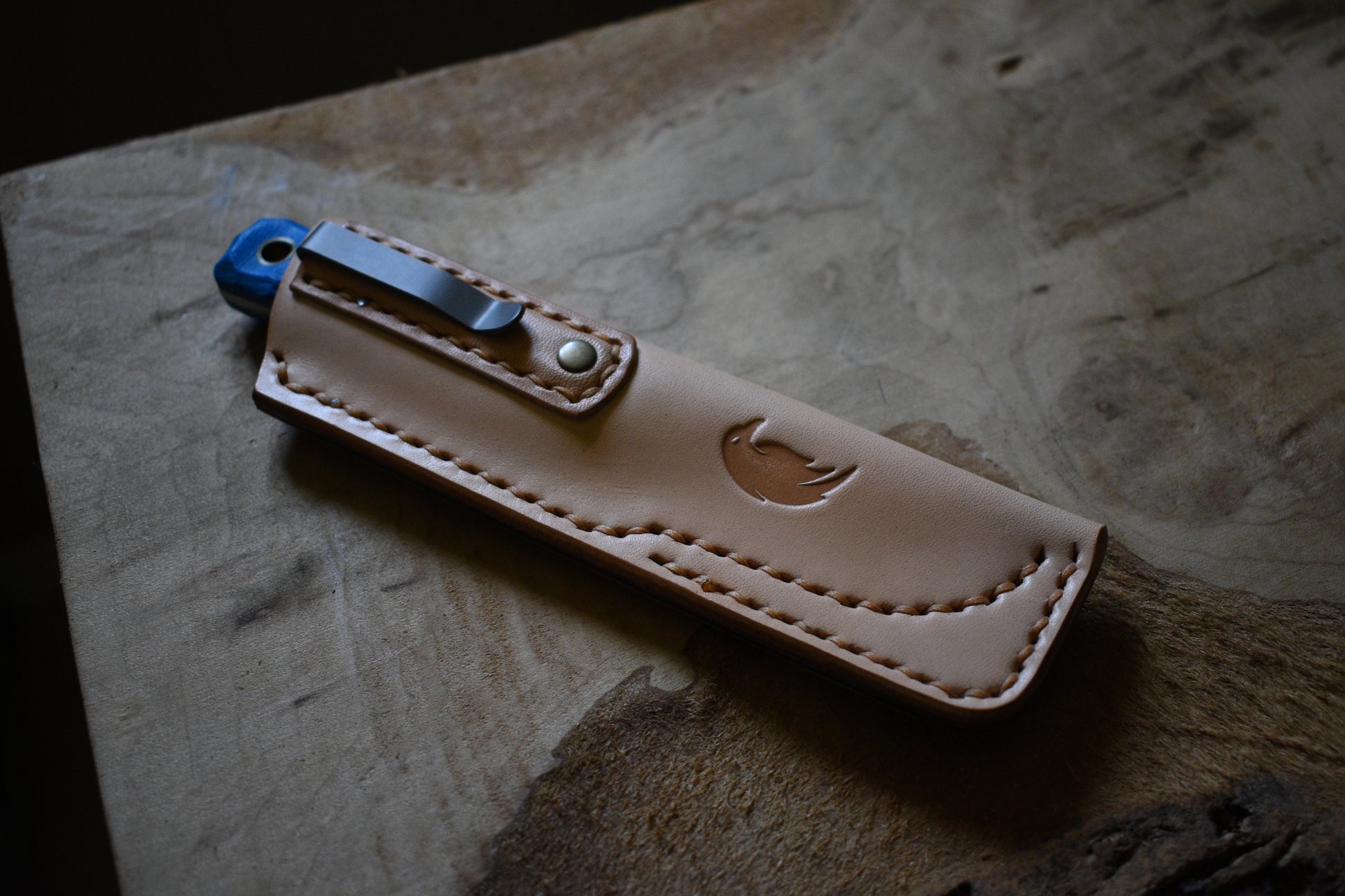 This sheath is cut from an ultraclean high grade Natural Vachetta leather, known for it's ability to take on a world class patina. Starting off almost a bright wheat color, over time it produces earthy caramel tones and deep browns on high points that burnish in the pocket over many years of carry.
