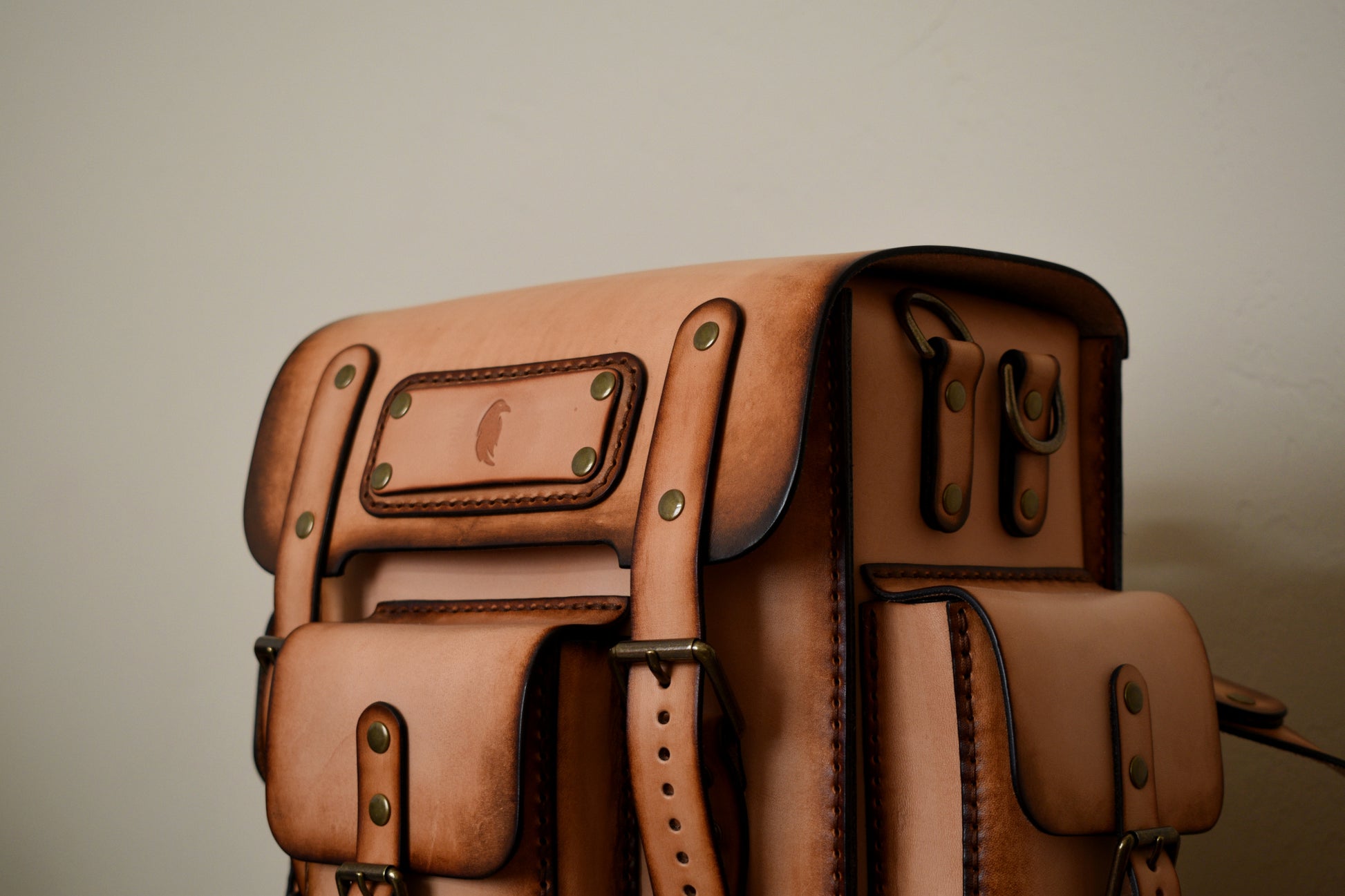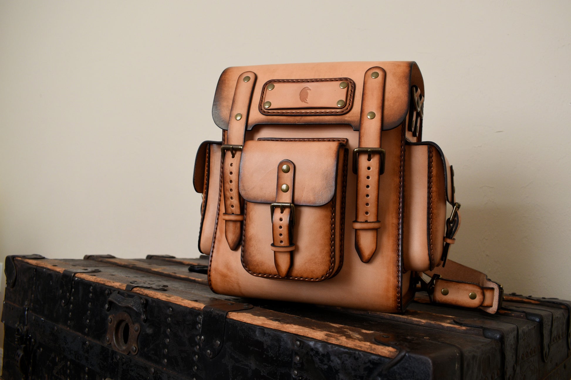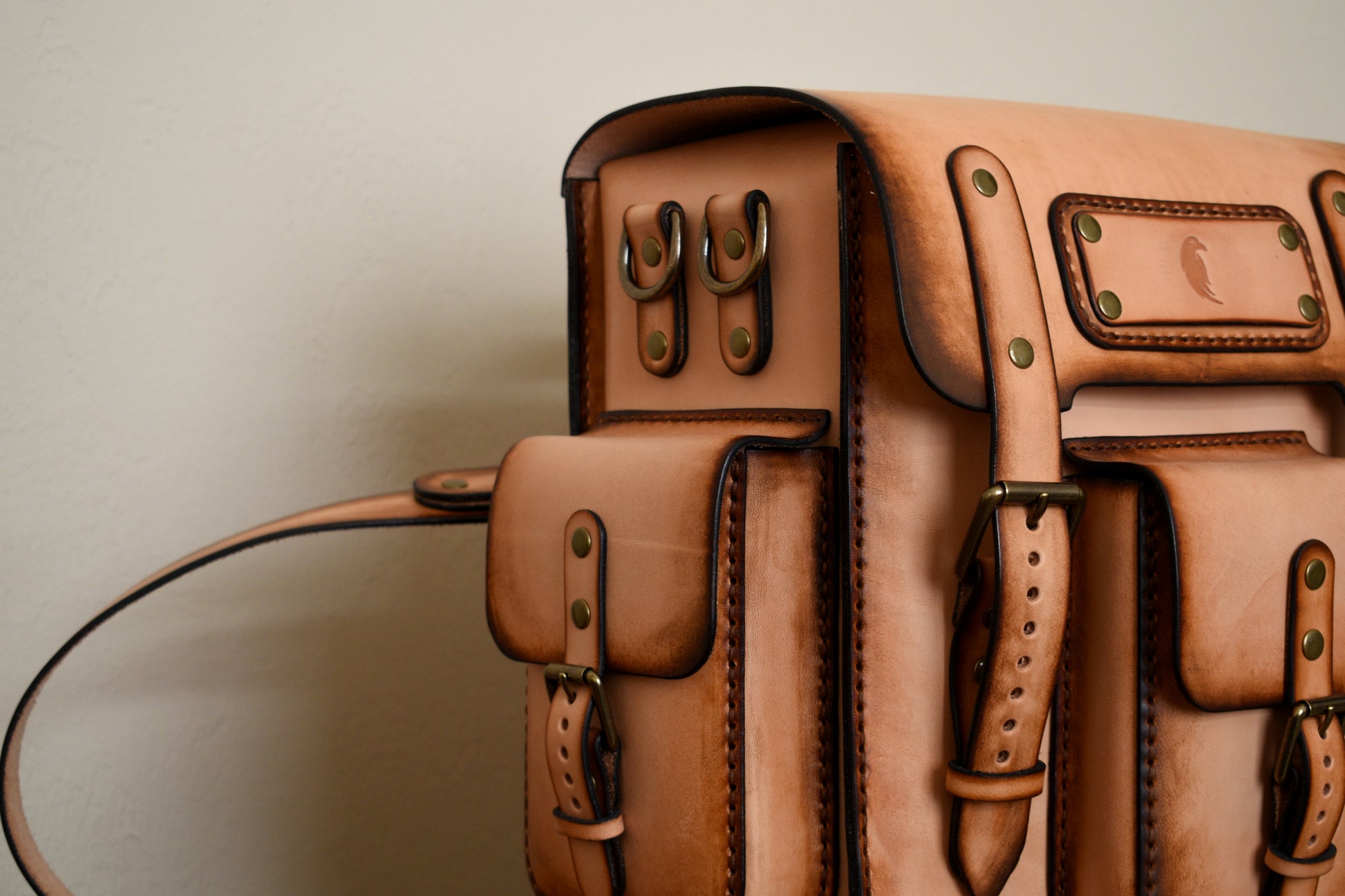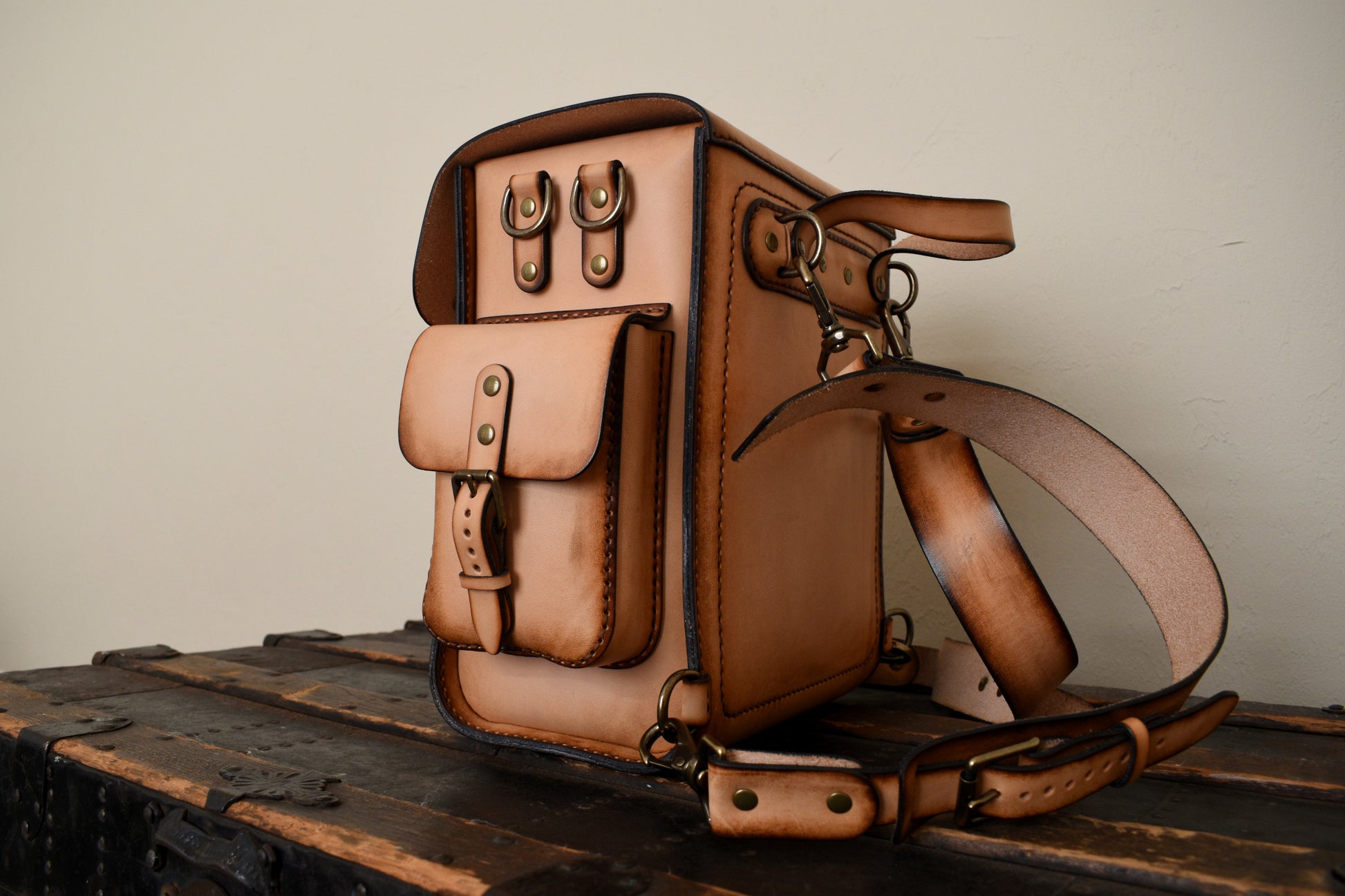 Stitched head to toe entirely by hand, featuring saddle stitching, premium full grain vegetable tanned vachetta leather, adjustable shoulder straps, 3 exterior pockets, a zippered interior pocket, and premium solid brass antiqued hardware. We've added an interior pocket for your cell phone, wallet, and other valuables.