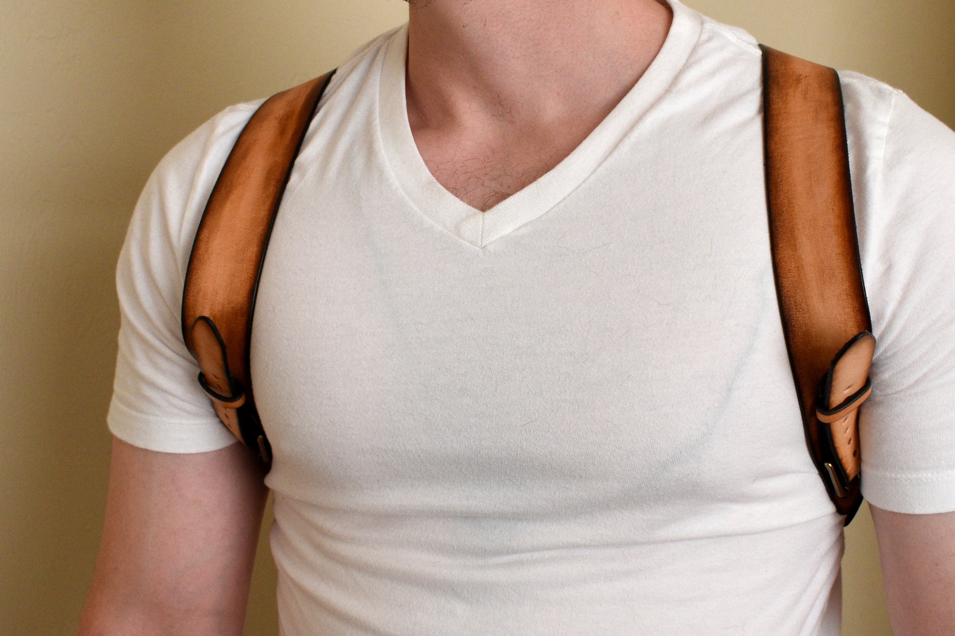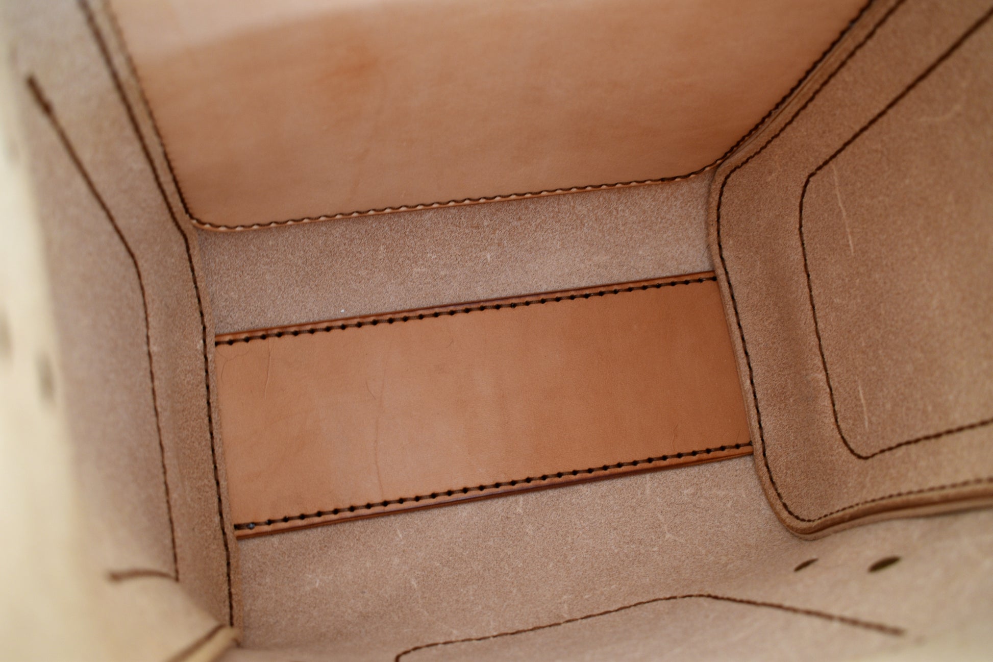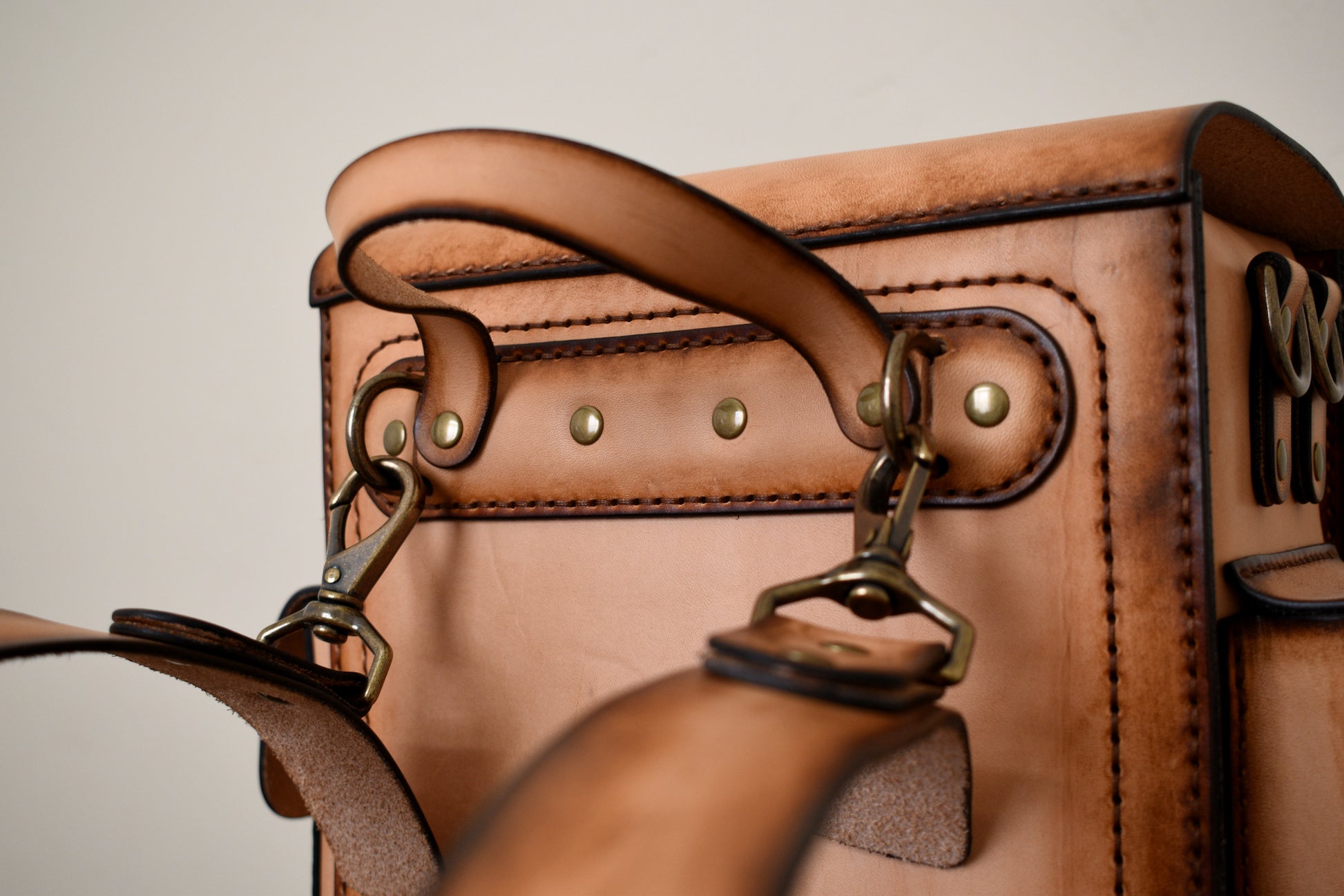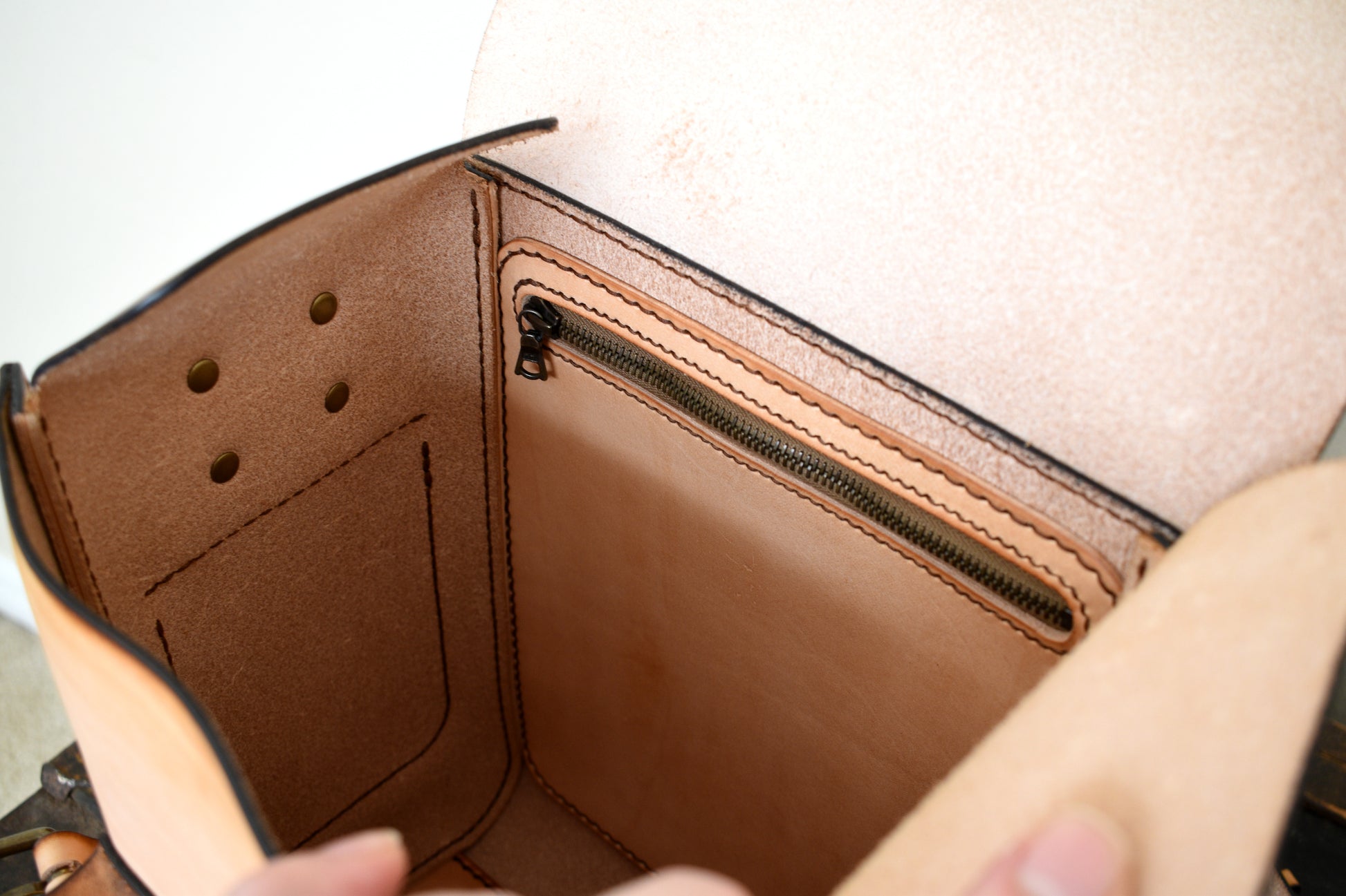 Stitched head to toe entirely by hand, featuring saddle stitching, premium full grain vegetable tanned vachetta leather, adjustable shoulder straps, 3 exterior pockets, a zippered interior pocket, and premium solid brass antiqued hardware. We've added an interior pocket for your cell phone, wallet, and other valuables.