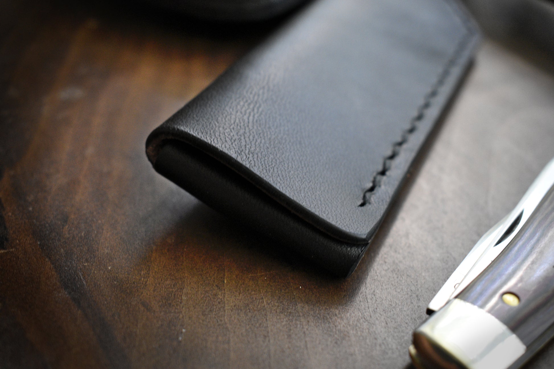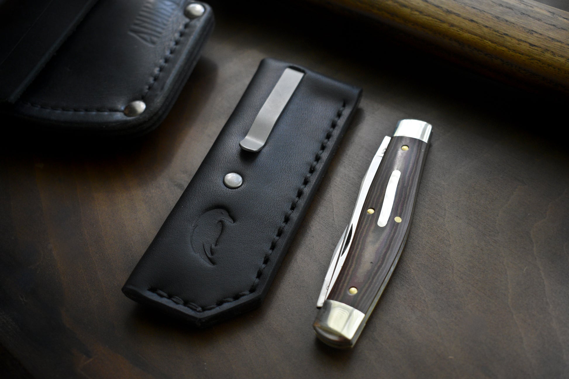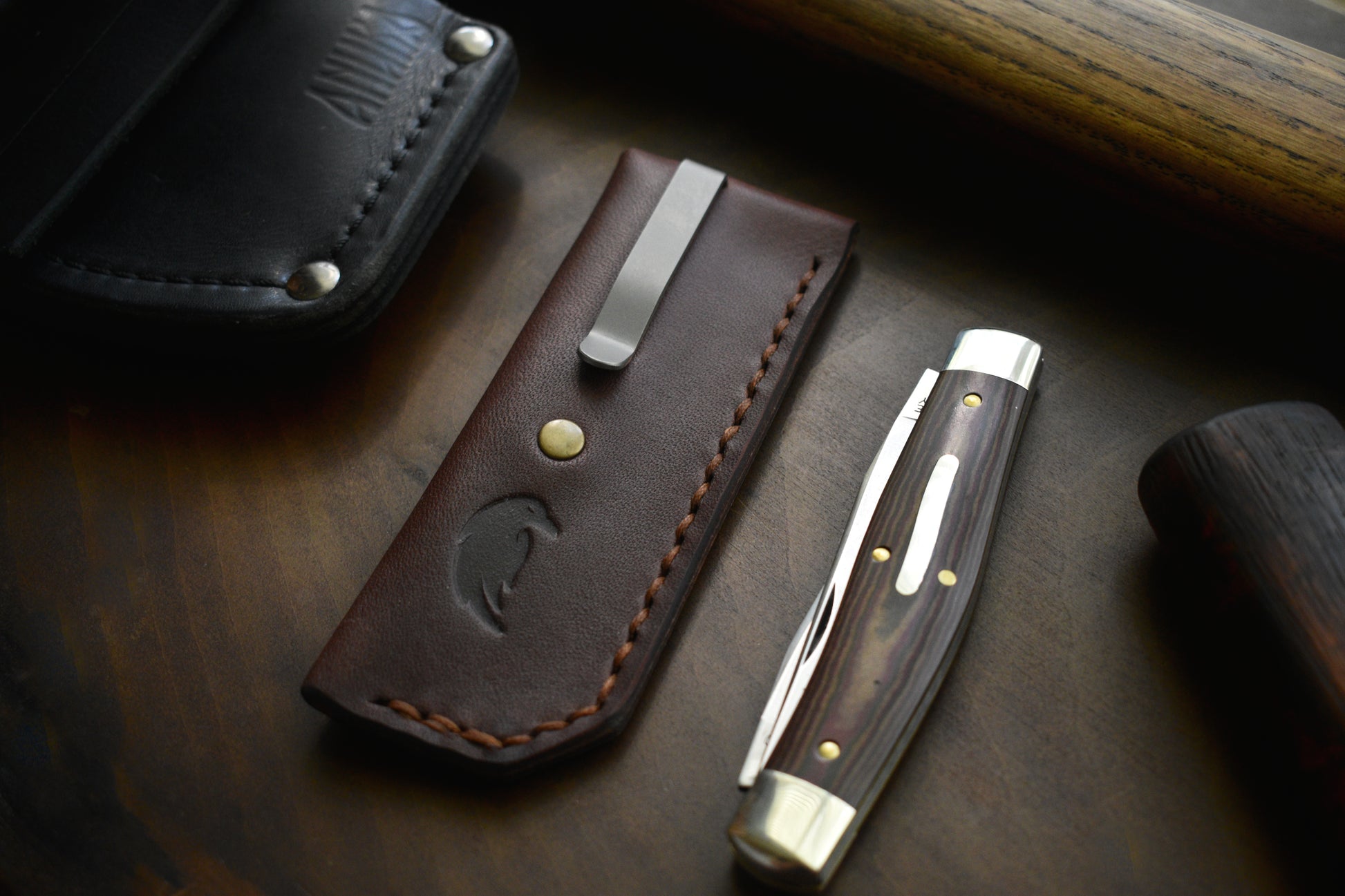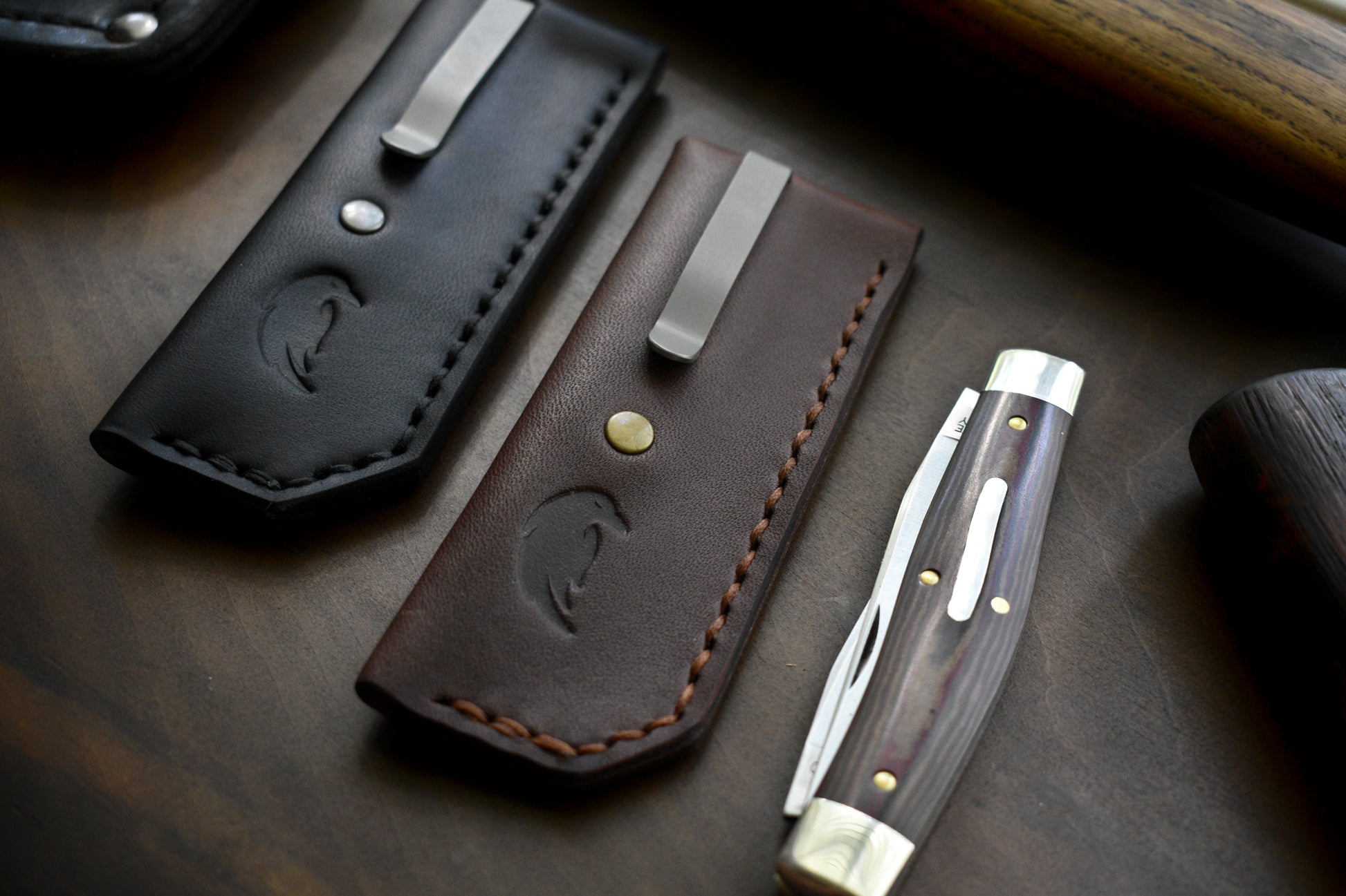 An elegant pocket slip with excellent retention for those slim profile slipjoints. The integral top grain interior panel creates a smooth surface that allows for a secure fit while still making the draw silky smooth. This clip slip is designed for traditional knives with thin and narrow profiles, and will be especially favored for carrying knives with smooth covers. A short break in period is to be expected.