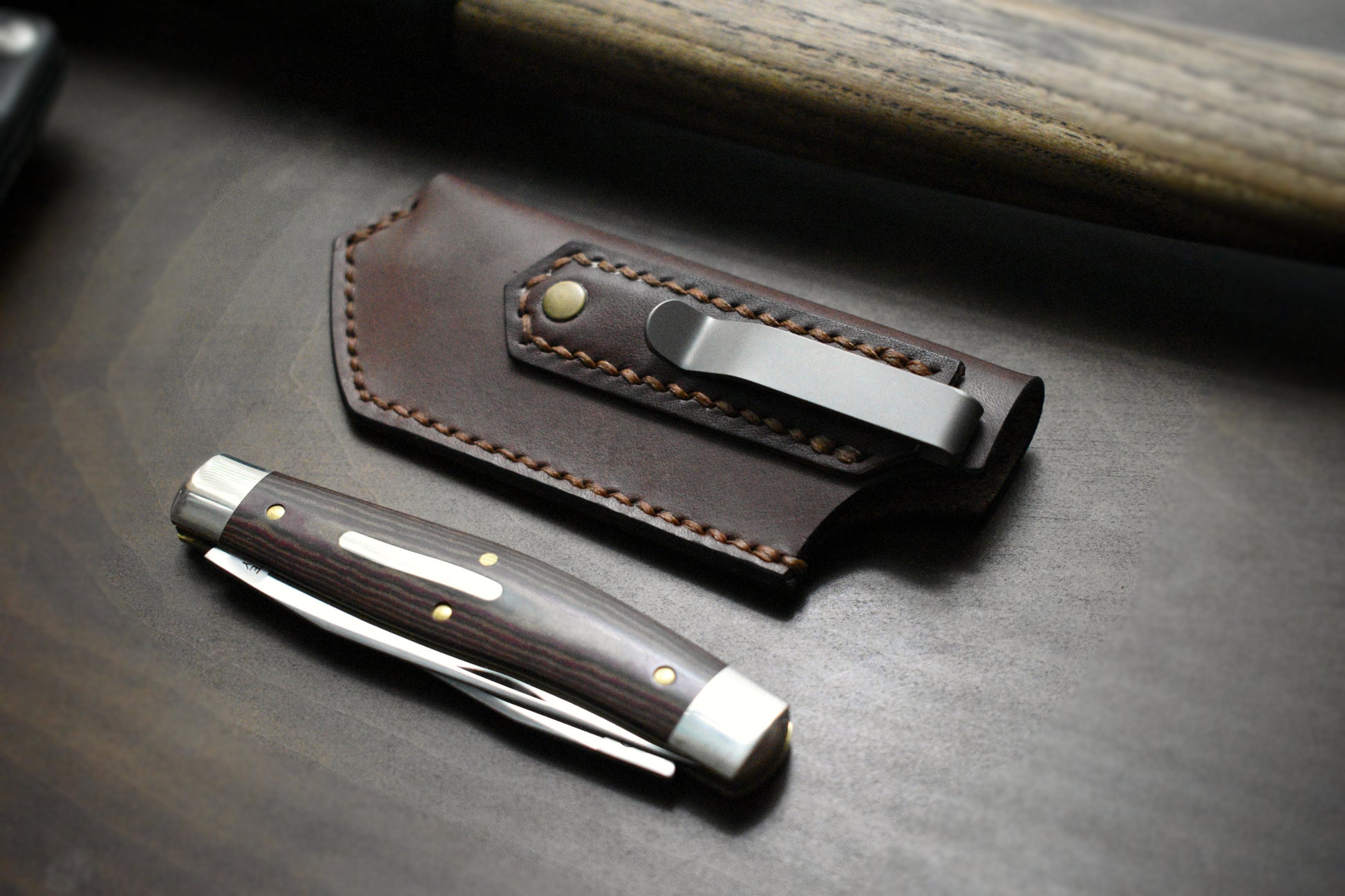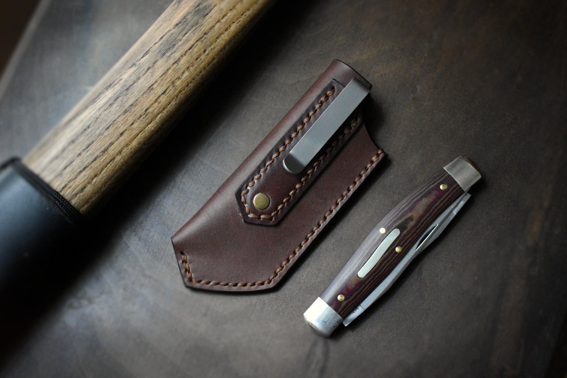 The Rogue was designed with one purpose, to be the best way to carry a slipjoint knife. The standard versions dimensions are such that mid-size slipjoints like the Benchmade Proper & GEC 71 Bullnose will have their lanyard holes line up right at the edge of the leather. Other popular slipjoints like the GEC 74, Lionsteel CK1, Maserin Plow, Boyscout camp knives, and a variety of medium GEC & Northwoods knives will fit just as well. If you would like a deeper carry or have a larger knife, we have an XL model. This pocket slip does not have a welt, so do not put a fixed blade knife in there for any reason.