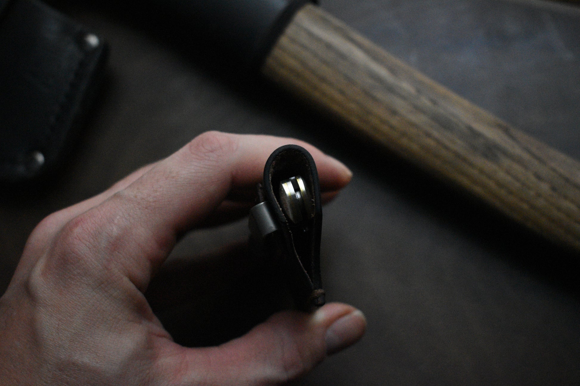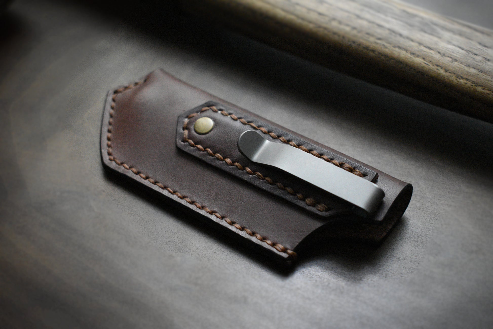 "The Rogue V3 is more 'pocket holster' than pocket slip. I handcraft each one from full grain vegetable tanned leather. The beefy all titanium clip adds structure and rigidity to the design; It's substantial in hand, has a good heft to it. You'll notice when your knife is in the slip, the titanium clip is positioned right where you would want it to be on the knife itself. Having the clip stationed up and to the right of center, allows the pocket slip to carry deeper and ride more comfortably. The clip-cover sandwiches the hardware between the leather chassis, making sure nothing metallic contacts your knife. Although it looks stylized, I can tell you every line, curve, and cutout on that slip was designed with a functional purpose in mind. It's a very compact slip and required a bit of tuning to get the retention right. I wanted something that would last a lifetime, get more beautiful with age, and tell the story of the knife when it comes time to pass it down. All the days of carry are written on that leather. There is no compromise anywhere on this build, it's not quick to make, and i didn't want it to be. When you get it in hand, I want you to think...wow, this feels different."
