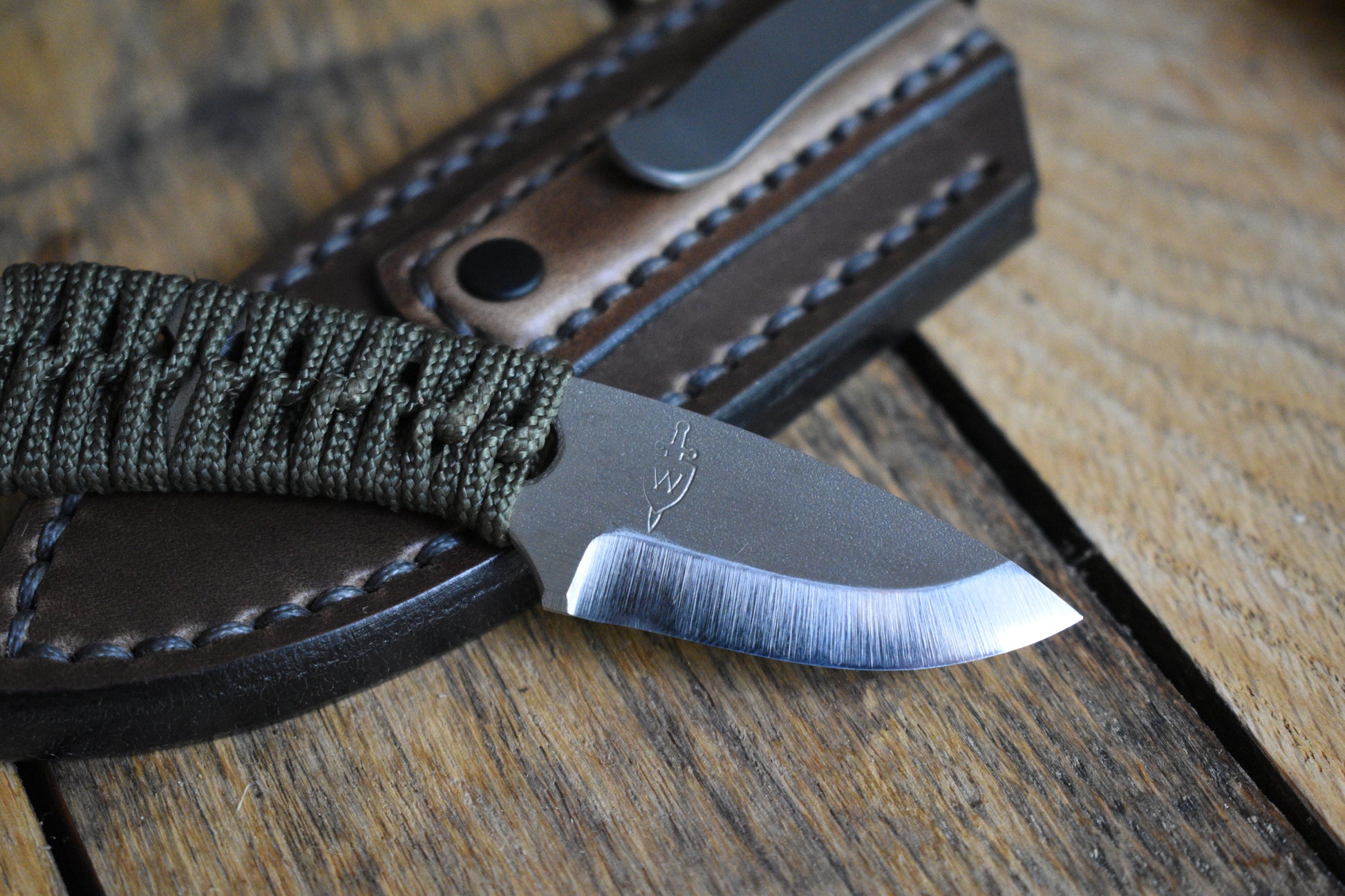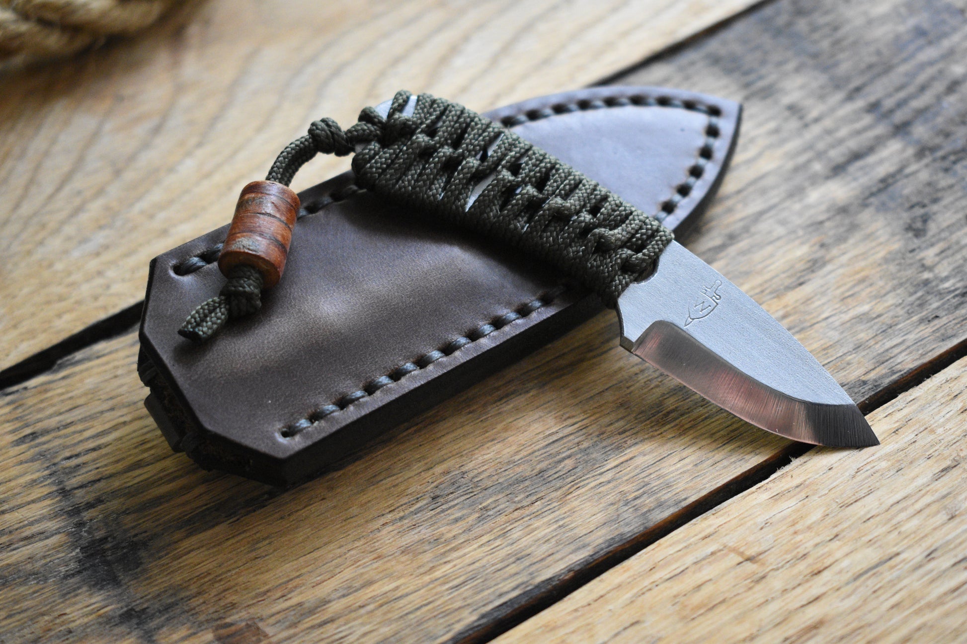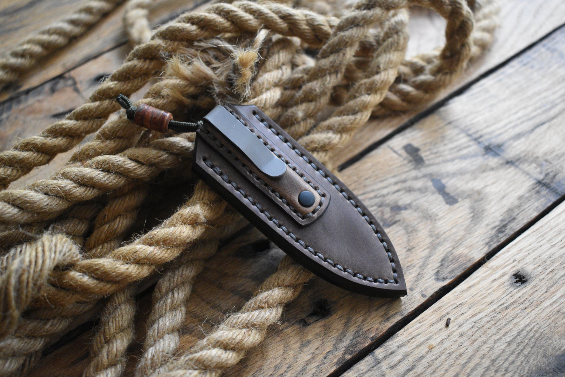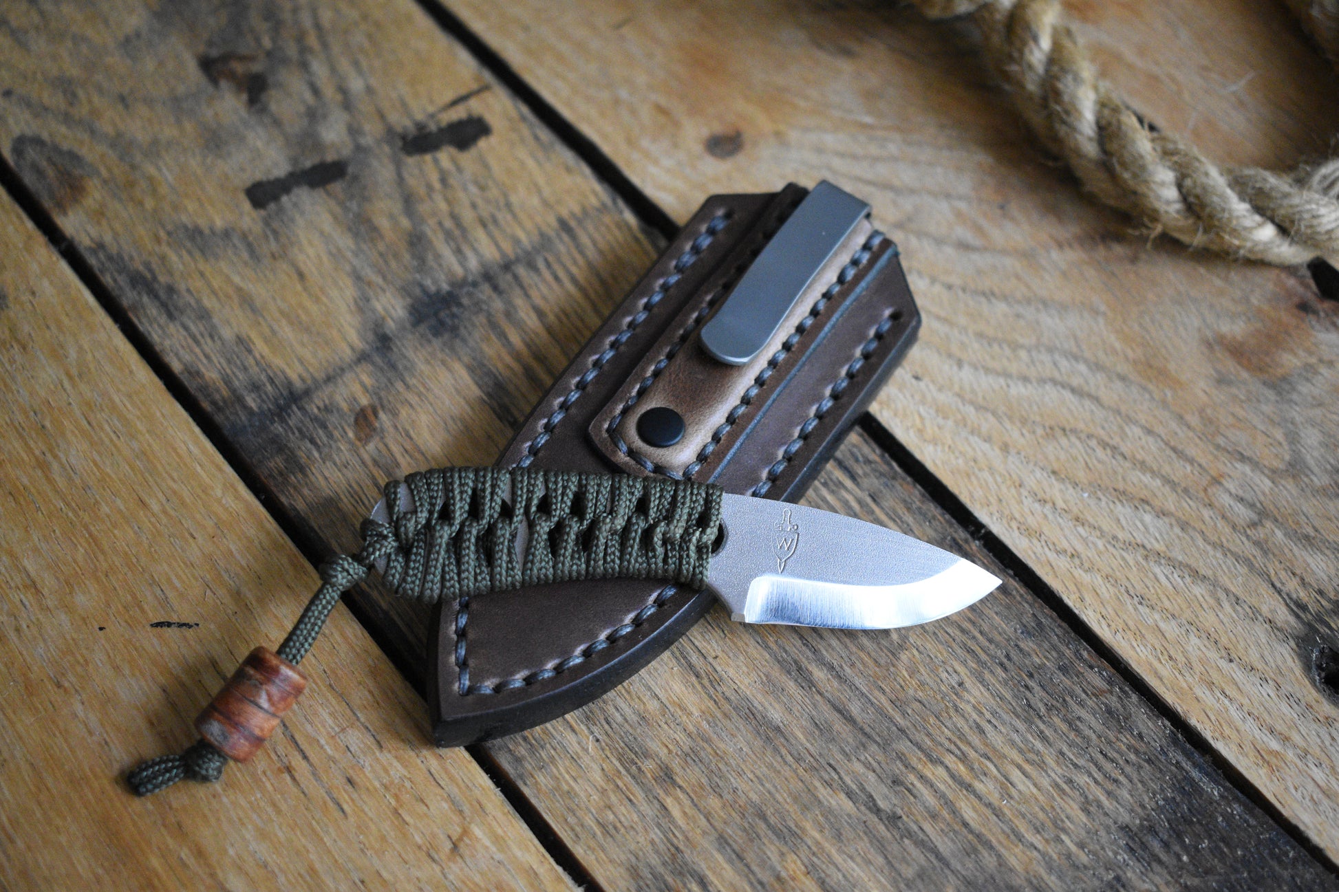 This unique offering combines a fixed blade, a pocket sheath, and a handmade leather bead to form an extremely compact, but capable edc setup that completely vanishes in the pocket.